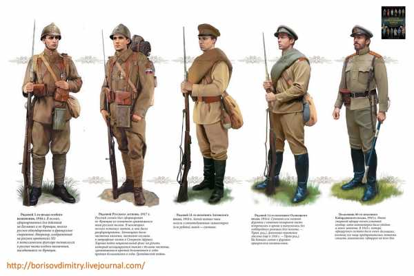 1914 г. в России было проведено несколько масштабных реформ обмундирования пехотинцев. Поражение от Японии потребовало оперативного внесения изменений в форму. Русские войска воевали с восточным соседом в белом или темно-зеленом (и даже черном) обмундировании. Несмотря на то, что униформа рядовых солдат и унтерофицеров была довольно простой и экономичной, она не всегда была практичной. В 1906 г. Военное министерство России оперативно провело испытания нескольких вариантов обмундирования защитного цвета и в 1907 г. решило перейти на мундиры, шаровары и фуражки цвета хаки зеленоватого оттенка. Из-за проблем со снабжением и влияния климатических условий было очень трудно сохранять нужный оттенок.