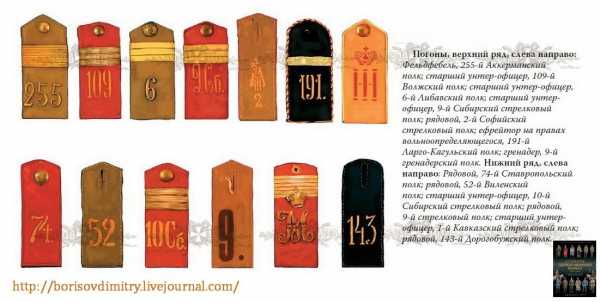 В составе русской армии насчитывалось немалое количество стрелковых полков, которые фактически мало чем отличались от обычных линейных пехотных полков. Среди них были обычные стрелковые полки, Финляндские стрелковые полки, Кавказские стрелковые полки, Туркестанские стрелковые полки и Сибирские стрелковые полки. В ходе войны были сформированы Латышские стрелковые полки. Солдат стрелковых полков можно было отличить по малиновым погонам. Такого же цвета была подложка офицерских погон. Кроме того, на погоне располагались шифровки (номер полка или монограмма). В дополнение на погонах солдат Туркестанских полков, кроме номера, помещалась литера «Т», в Латышских полках — русская буква «Л», в Сибирских — «С». На погонах 13-го стрелкового полка помещалась шифровка «НН» (кириллицей) и число 13, в 15-м полку — шифровка «НI» и число 15, а в 16-м — шифровка «АIII» и число 16 под ней. 1-й Кавказский полк имел шифровку «М». Шифровки (монограммы) Сибирских полков указаны в таблице ниже.