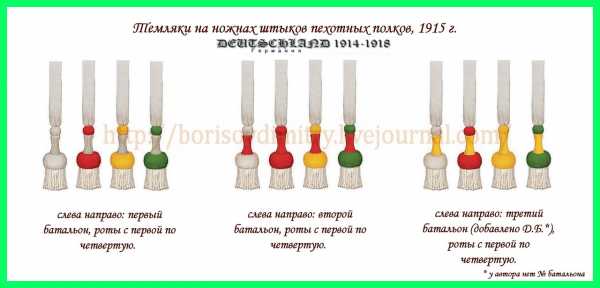 В резервных полках на чехол наносили букву R. Офицеры носили шлемы более высокого качества или фуражки. Последние были серого цвета, имели красные кант и околыш, черный козырек и подбородный ремешок. На тулье крепилась имперская кокарда (снаружи черного, в центре — белого и красного цветов), на околыше — государственная кокарда. На фуражку можно было надевать серый чехол. Снаряжение состояло из поясного ремня из натуральной кожи, который имел пряжку с государственным гербом: с короной и надписью «GOTT MIT UNS» (С нами Бог!) в прусских полках или гладкая для унтер-офицеров. Кроме того, к поясному ремню подвешивались два трехсекционных подсумка из натуральной кожи и штык. Последний имел темляк, белый сам по себе, с ножкой и узлами, цвет которых разнился в зависимости от номера роты или батальона. Темляки унтер-офицеров имели белые узлы, прошитые нитями цветов государственного флага. Пехотинцы носили ранец из телячей кожи с лямками. В 1913 г. на снабжение был принят ранец из коричневого брезента. Шинели скатывали и приторачивали к ранцу ремешками, котелок прицепляли к клапану ранца. Фляги в чехле из войлока или хлопчатобумажной ткани, а также сухарную сумку прикрепляли сзади под ранцем. Пехотинцы имели при себе шанцевый инструмент. Унтер-офицеры были вооружены пистолетами. Офицеры изначально имели право носить серебряные пояса с нитями цвета государственного флага. Вооружение офицера состояло из пистолета и шпаги. Снаряжение включало бинокль в футляре и полевую сумку.