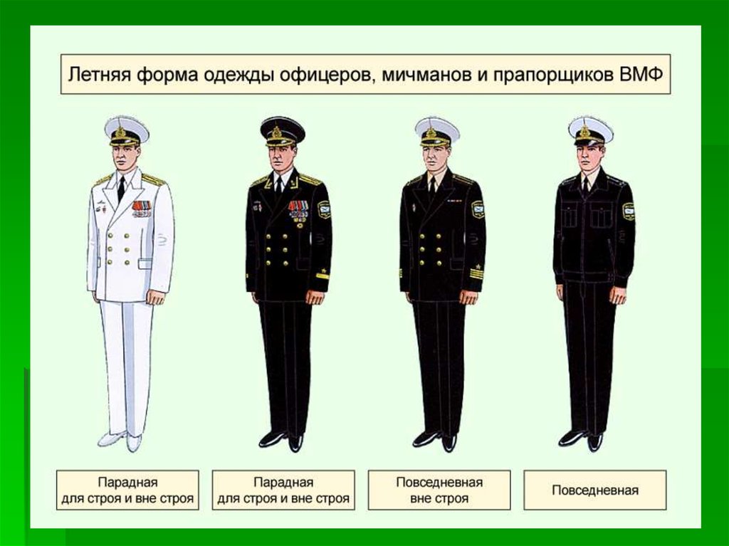 Теперь, рассмотрев повседневное флотское одеяние, перейдем к другим различным видам морской формы. Их существует несколько видов, среди которых такие, как: