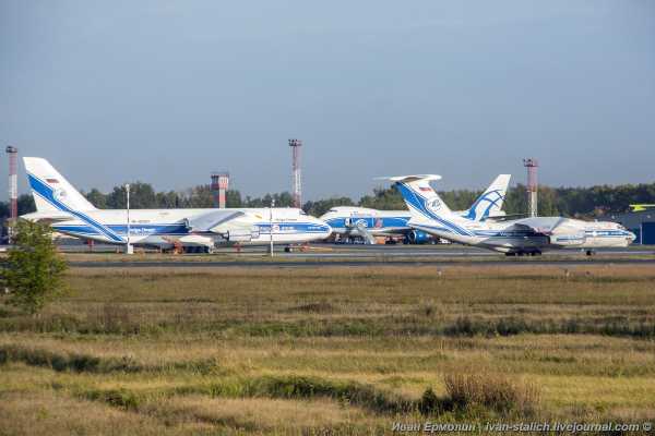 Почти по Конан Дойлю: «Этюд в сине-белых тонах». Это самолеты, входящие в Российскую Группу компаний «Волга-Днепр». Тут мы видим Ан-124, Ил-76 и Boeing 747-8