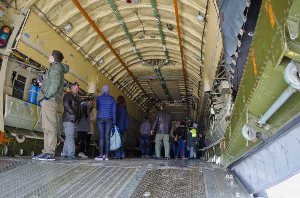Грузолюк открыт, мы внутри грузовой кабины. Сугубо истинное назначение ИЛ-76 — транспортировка практически всех видов вооружения и техники используемой в воздушно-десантных войсках, а так же не менее 80% вооружения и техники других родов войск. Длина 20 метров (+ 4,5 рампа), ширина 3,45 м и высота 3,4 м. Грузоподъёмность машины составляет 50 т. Максимальная взлётная масса 190 т. Дальность полёта с максимальной загрузкой 3600 км. Здесь могут разместиться 126 десантников с личным оружием, при стандартной транспортировке — 145 солдат или 33 тонны груза включая технику, например + три БМД.
