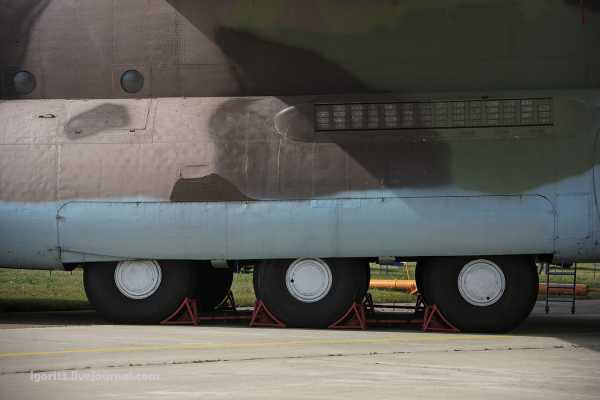На этом фото хорошо видно многоопорное шасси, снабжённое 24-мя колёсами, которое позволяет эксплуатировать Ан-124 с грунтовых ВПП, а также изменять угол наклона фюзеляжа, что облегчает проведение погрузок.