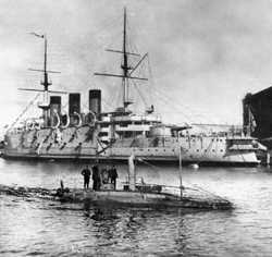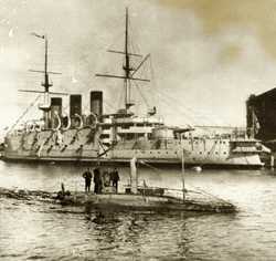 Подводная лодка «Дельфин» и броненосец «Победа» в Порт-Артуре.