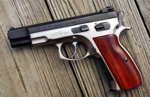 CZ 85 B модификации Combat, отличающейся наличием регулируемого целика. Пистолет выполнен с двухцветной отделкой и имеет нестандартные деревянные щечки рукоятки.