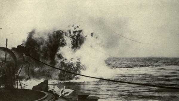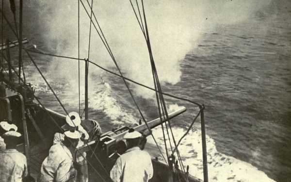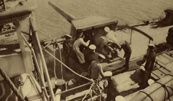 Французские морские пехотинцы ведут стрельбу с борта крейсера в Dardenelles