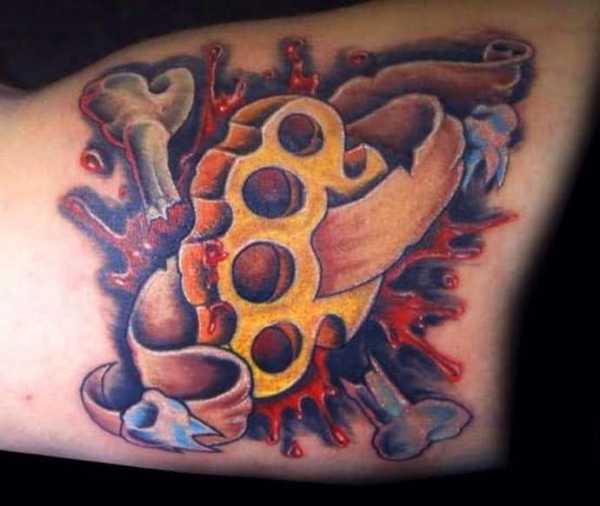 Вряд ли многим из нас доведется в реальной жизни использовать настолько необычный предмет, а вот в искусстве нательного рисунка тату кастета встречаются довольно часто – фото с интересными примерами вы увидите ниже.