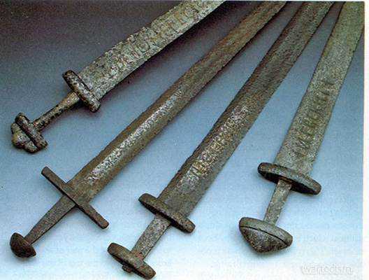 Навершие, перекрестие, а в отдельных случаях и саму рукоять этих мечей обильно украшали инкрустациями из золота, серебра, меди и латуни, нередко в самых различных цветовых сочетаниях. Сама рукоять была довольно короткой и зажимала руку воина, сжатую в кулак. Фехтовать таким мечом было практически невозможно. Им наносили сильные рубящие удары, от которых никакая кольчуга не спасла, однако достаточно надежной защитой являлся цельнокованый умбон щита, на который в крайних случаях обычно и старались их принимать. Мечи викингов и англосаксов при этом отличались по конструкции, хотя внешне и были довольно-таки похожи. Известно, что стоимость меча у англосаксов достигала 120 быков или 15 рабов мужского пола. Как и всякой ценной вещи, мечам давали имена. Все знают, что меч легендарного Роланда назывался Дюрандаль. А вот меч Карла Великого тоже имел свое имя – Жуайез, что значит «радостный». У викингов самым популярным именем было «Ногокус», а все от того, что они практиковали удары им под щит, и, следовательно, (и археологи это только подтверждают!) чаще всего они получали ранения в ноги!