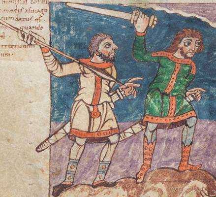 Миниатюра из манускрипта 1290 г с изображением приемов фехтования на мечах с применением щита баклера. (Королевский Арсенал, Лидс)