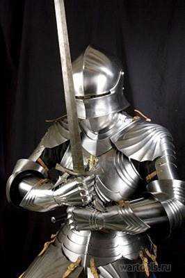 Вот эти-то мечи и получили название норманнских, по изображениям на вышивке Байё, но это общеевропейский тип меча, встречавшийся повсеместно. Другим типом рыцарского меча приблизительно около 1300 г. стал так называемый «меч войны», имевший клинок как с долом, так и ромбического сечения и суженный к окончанию, так что им стало возможно уже не только рубить, но и колоть. По-другому его называли еще «длинный меч», да он и в самом деле был длинным (101-121 см, из которых на рукоять приходилось 17-22 см, при весе около 1,2-1,4 кг), вследствие чего его обычно возили на лошади слева у седла. Есть факты, которые указывают на то, что впервые такие мечи появились уже около 1150 г., причем связано это было с распространением в рыцарской коннице лошадей крупных пород, из-за чего обычным мечом со спины такой лошади до лежащего на земле пехотинца рыцарь уже не дотягивался!