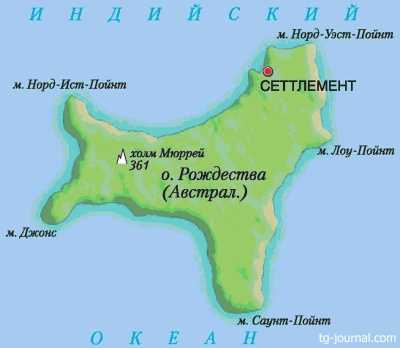Остров Рождества остров в Индийском океане, расположенный примерно в 224 милях (360 км) к югу от острова Ява и в 870 милях (1400 км) к северо-западу от Австралии, который управляется как внешняя территория Австралии. Остров является вершиной океанской горы, с вершиной, Мюррей-Хилл, поднимающийся на 1,184 фута (361 м) в западной части острова. Главный поселок и главный порт находятся на северо-восточной части острова.