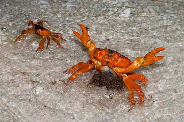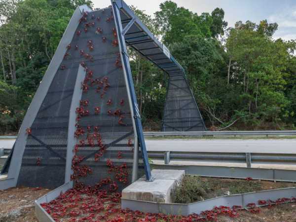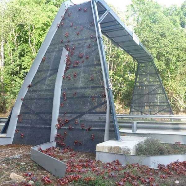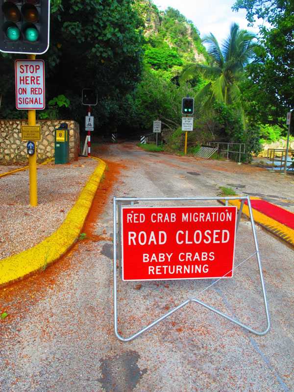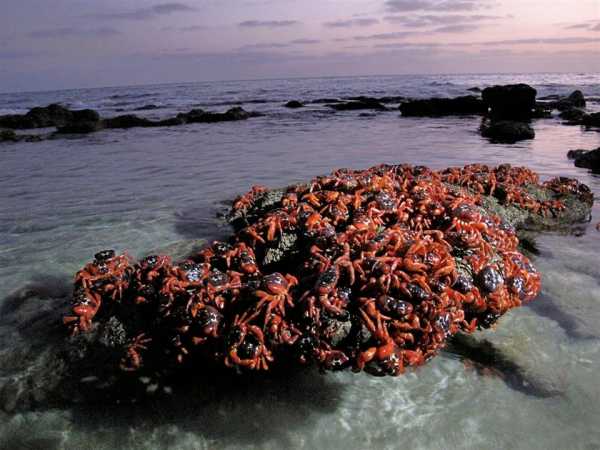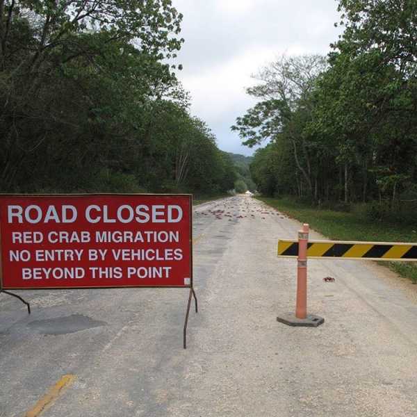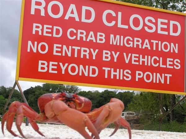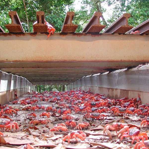 Миграция красных крабов на острове РождестваВзрослые особи этого вида краба не имеют на острове естественных врагов (но желтый сумасшедший муравей может нападать на молодняк), поэтому популяция разрослась до невероятных размеров. Большую часть времени красные крабы живут в лесах и на побережье, но каждый год примерно в ноябре природные инстинкты гонят миллионы особей в прибрежные воды для того чтобы отложить яйца и продолжить род. По подсчетам ученых до 100 миллионов крабов в сезон мигрируют через остров Рождества. Это явление признано одним из чудес света. Миграции крабов уделяется повышенное внимание, как со стороны туристов, так и со стороны властей. Туристам крайне интересно увидеть это уникальное природное явление, а властям очень важно защитить мигрирующих крабов в период размножения. Для этого даже перекрывают дороги и устанавливают специальные знаки, предупреждающие о миграции. В некоторых местах для крабов построены специальные переходы, поразительно похожие на традиционные надземные пешеходные переходы.