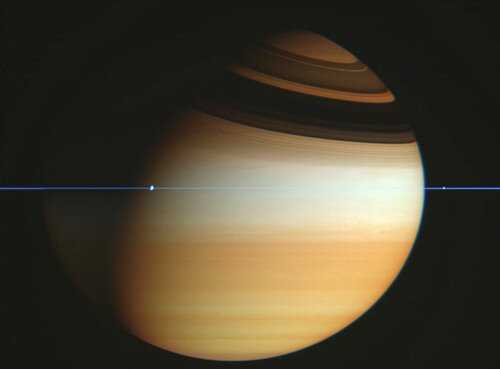 Вид издалека на Энцелад, который является крошечным пятнышком справа от центра чуть выше тонкой линии маркировки кольца Сатурна. Кольца отбрасывают тени на все северное полушарие в виде полос.