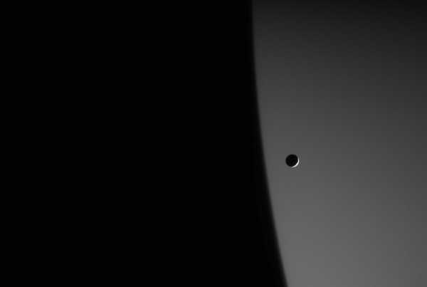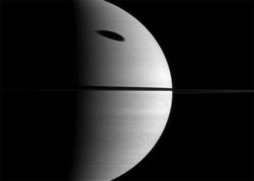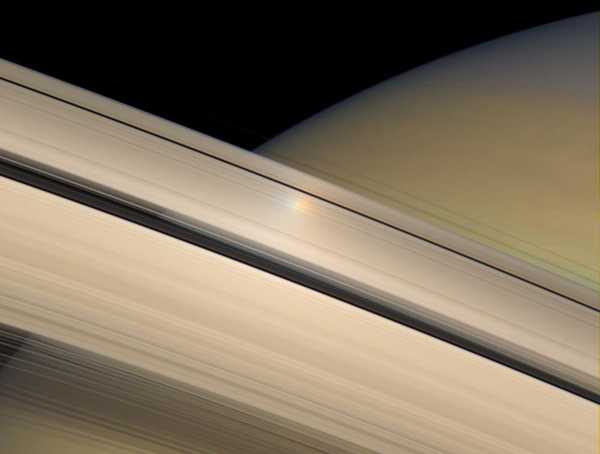 На этом снимке Солнце находится прямо за Сатурном, в миллиардах километров. Свет от Солнца проходит через кольца Сатурна, показывая невидимое раньше кольцо E, расположенное с внешней стороны.