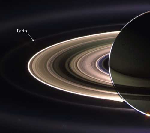 И в конце посмотрите на эту перспективу: в правом нижнем углу видна небольшая стрелка, указывающая на крошечную бледно-голубую точку. Это Земля. Внутри Сатурна могли бы поместиться 764 Земли.