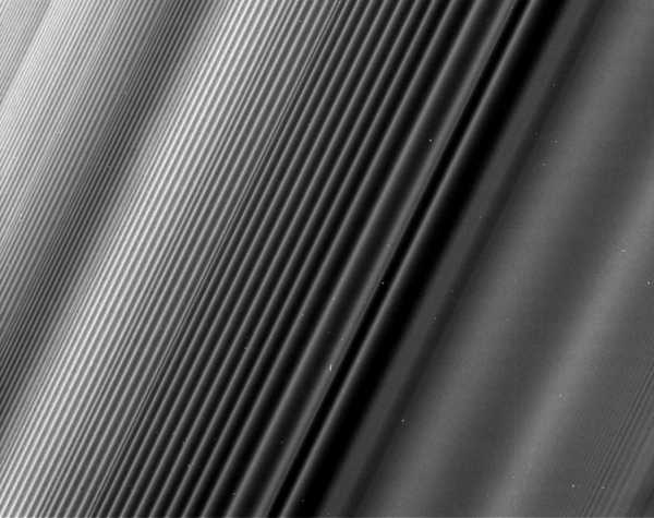 Здесь показан детальный вид четырех внутренних колец Сатурна. Ближайшим к планете является кольцо D, а следующими по пути наружу идут кольца С, В и А. Кольца разделены тонким пустым промежутком.