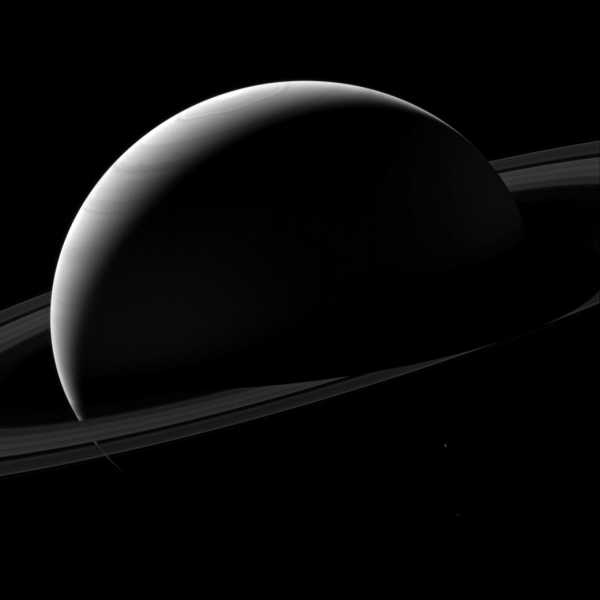 Темная сторона Сатурна. В правом нижнем углу спутник Сатурна — Тефия (Тетис). Снимок был сделан космическим аппаратом Кассини на расстоянии примерно 2,4 млн. км 15 января 2015 года.