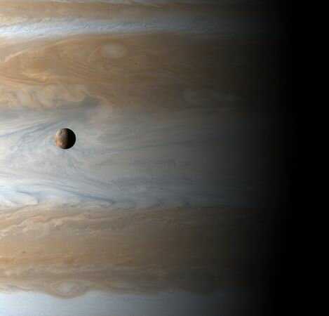 До Сатурна, «Кассини» посетил Юпитер и сделал ряд снимков крупнейшей планеты Солнечной системы. На представленном фото один из самых известных спутников газового гиганта Ио, славящийся своей вулканической активностью.