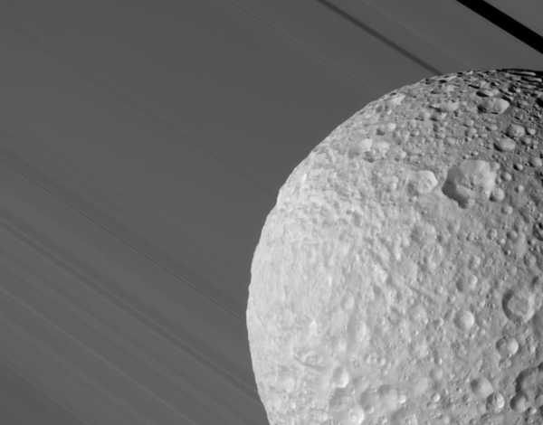 16. Мимас на фоне Сатурна. (Фото JPL | Space Science Institute | NASA):
