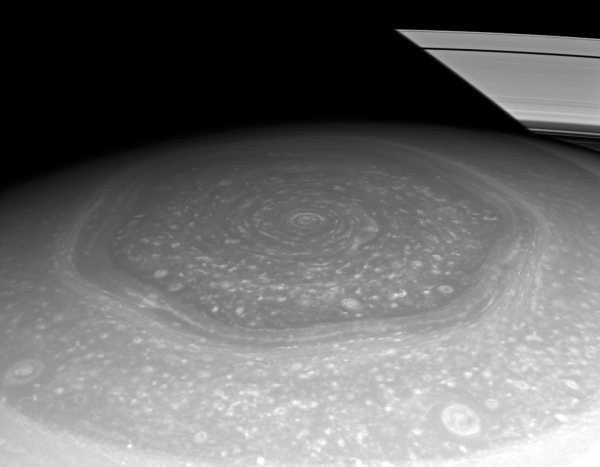 На этом снимке виден северный полюс Сатурна с шестигранным ураганом колоссальных размеров.