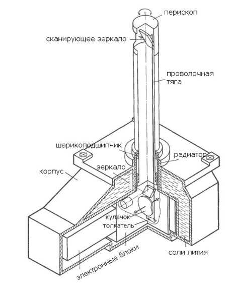 Конструктивно камера разбивается на две части: основной корпус и перископическое устройство. Перископ выносил за пределы теплоизоляционных оболочек сканирующее зеркало и располагается в зоне, где температура могла достигать 475°С. Основной же корпус с электронными блоками и оптической системой находится в зоне, где рабочая температура не превышала 40-50°С. Перископическое устройство выполнено в виде тонкостенной трубы из материала с низкой теплопроводностью. Качание зеркала от кулачка и толкателя производилось через проволочную тягу длиной 250 мм. Труба перископа, вращавшаяся при панорамном обзоре, была установлена на шарикоподшипниках, между которыми был расположен радиатор, обеспечивающий передачу тепла на корпус. В самом корпусе по всему периметру были сделаны герметичные полости, заполненные тригидратом азотнокислого лития, обладающим большой теплоемкостью.