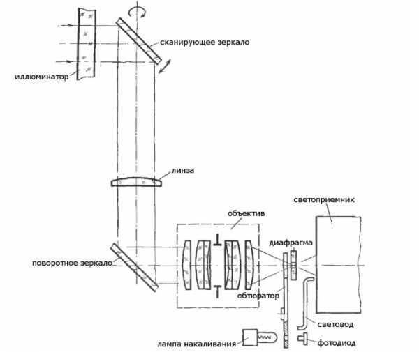 Пучок лучей от поверхности, проходя через иллюминатор, становится расходящимся в сагиттальном сечении, так как иллюминатор представляет собой цилиндрическую линзу (см. фотографию выше). Расходящийся пучок падает на сканирующее зеркало и, отражаясь от него, попадает на компенсирующую цилиндрическую линзу, передний фокус которой совпадает с задним фокусом иллюминатора. После линзы пучок снова становится параллельным и, отражаясь от поворотного зеркала, проходит через объектив с фокусным расстоянием 28 мм и относительным отверстием 1:2. В плоскости изображения стоит диафрагма, которая является развертывающим элементом, формирующим апертурную характеристику камеры. После диафрагмы пучок попадает на светоприемник. На время обратного хода строчной развертки световой поток перекрывается гребешком обтюратора. В это же время фотодиод засвечивается лампой накаливания через отверстие на обтюраторе и формирует электрический импульс начала обратного хода. Во время обратного хода происходит калибровка прибора. Для этой цели свет от лампы, яркость которой стабилизирована, с помощью световода подается на светоприемник.