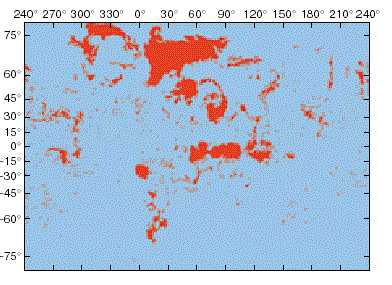 Схема распределения тессер (красный цвет) на поверхности Венеры (по М.А. Иванову, 1998)