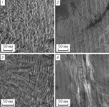 Главной морфологической чертой тессер является сочетание различных по форме и размерам гряд, сильно различающихся по своим очертаниям и протяженности (рис. 3). Гряды могут быть линейными и протяженными длиной до многих сотен километров. А могут быть и острыми или, наоборот, закругленными, иногда и с плоской вершинной поверхностью, ограниченной вертикальными уступами, что напоминает сочетание ленточных грабенов и горстов в земных условиях (рис. 3,2 и 3). Само расположение гряд может быть линейным, когда гряды параллельны друг другу или размещаются кулисообразно (рис. 3,4), либо они изгибаются, образуя петли (рис. 3,1).