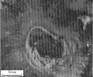 Еще одним типичным структурным рисунком поверхности Венеры являются венцы или короны с трещинами, рельеф которых немного выше рельефа темных равнин (рис. 4). Венцы представляют собой структуры с концентрическим строением, осложненным радиальными трещинами. Кольцевое обрамление у венцов обычно неполное. Хорошо выраженными бывают несколько секторов, а в других оно может отсутствовать. Местами можно наблюдать, что кольцевые гряды являются как бы продолжением линейных или извилистых гряд, и это может свидетельствовать об одновременности их формирования.