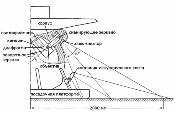 Как уже говорилось выше, камера была расположена внутри герметичного и теплоизолированного корпуса. Съемка поверхности производится через цилиндрический иллюминатор, внутри которого установлено сканирующее зеркало и элементы его привода. Обзор окружающей поверхности в номинальном угле 40х180° осуществляется за счет двух движений сканирующего зеркала — вращения вокруг оси панорамирования и качания в плоскости, проходящей через эту ось. Для повышения надежности получения изображения в условиях пониженной освещенности или очень малых контрастов снаружи были установлены два источника искусственного света, освещающих локальные зоны поверхности в двух секторах панорамы.
