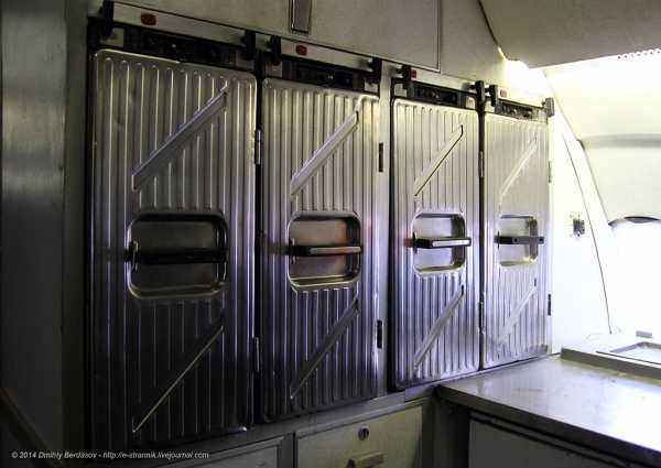 Тумблеры управления в передней кухне, за которую, как правило, отвечал старший бортпроводник. На машинах с компоновкой 180 кресел маленькая передняя кухня — единственная. На таких машинах сервировались только прохладительные напитки или холодный завтрак.