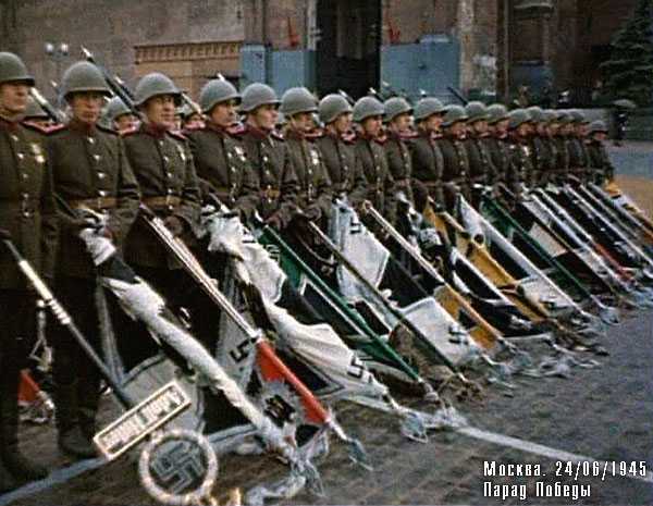 Марш сводных полков завершала колонна солдат, нёсших 200 опущенных знамён и штандартов разгромленных немецких войск. Эти знамёна под дробь барабанов были брошены на специальный помост у подножия Мавзолея Ленина. Первым был брошен Фёдором Легкошкуром лейбштандарт LSSAH — батальона СС личной охраны Гитлера.