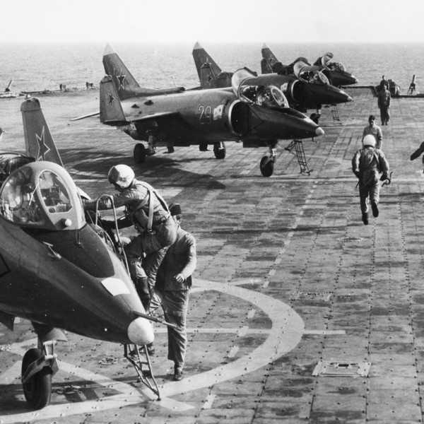 Взлет звена Як-38М по тревоге. Палуба ТАРКР «Минск».