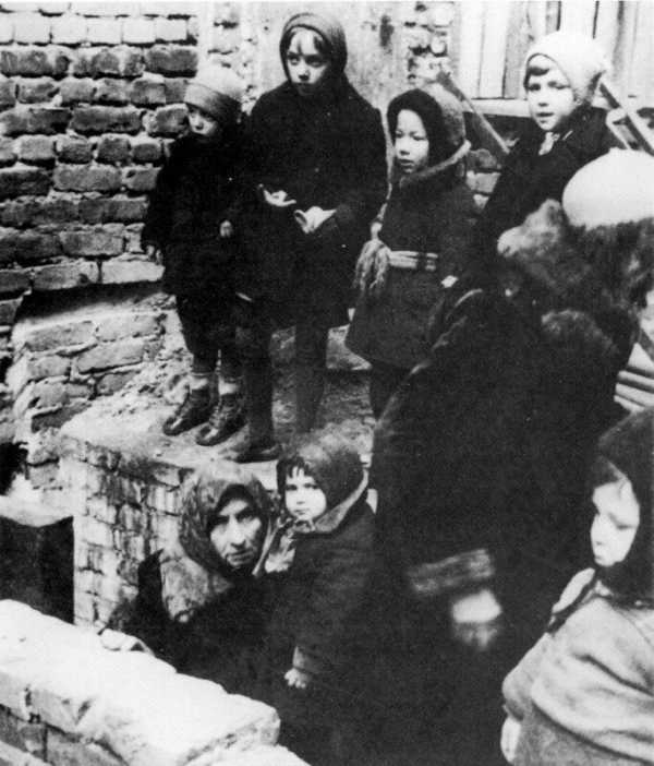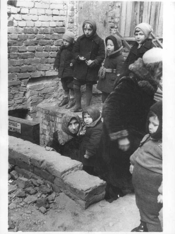 Маленькие жители блокадного Лениграда у бомбоубежища