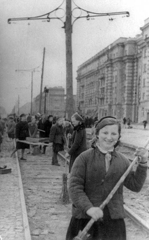 89. Ленинградцы работают на воскреснике по очистке города на проспекте Володарского. 08.03.1942 г.