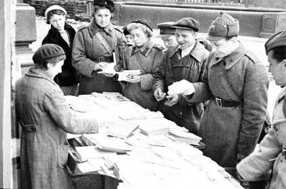 73. Ленинградцы и красноармейцы у приказа войскам Ленинградского фронта о снятии блокады города. Январь 1944 г.