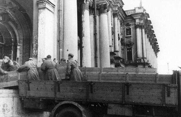 39. Солдаты разгружают ящики с экспонатами Государственного Эрмитажа, возвращенными из эвакуации в г.Свердловск. 1945 г.