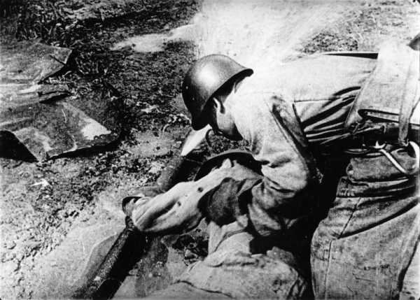 43. Ленинградский пожарный оказывает помощь своему пострадавшему товарищу.