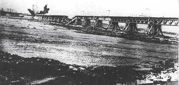 51. Разрушение в результате немецкого артобстрела временного моста через Неву на линии Поляны — Шлиссельбург. 1943 г.