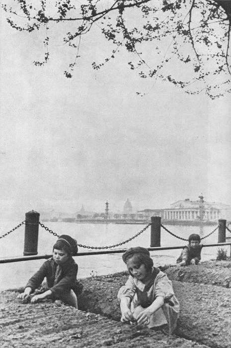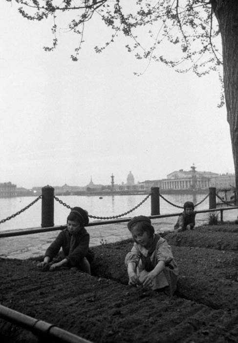 60. Дети блокадного Ленинграда у грядок на Мытнинской набережной. 1942 г.