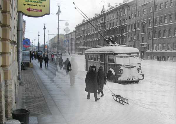 серия фотографий автора Давида ТрахтенбергаЛенинград, Невский проспект. Остановившиеся из-за отсутствия электричества троллейбусы