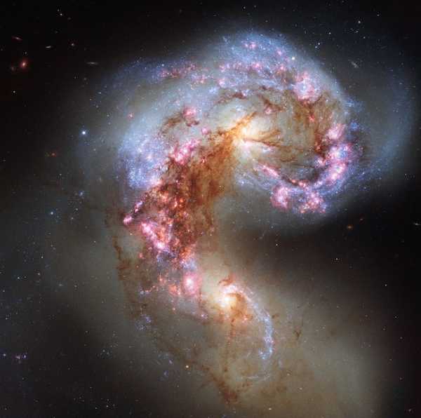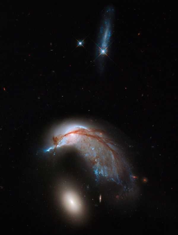 Обычно галактики расположены достаточно далеко друг от друга, но иногда случается обратное. Момент слияния двух галактик можно увидеть на новом изображении, полученном с телескопа Хаббл.