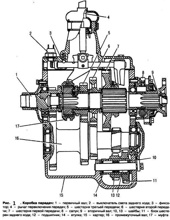 В картере на подшипниках установлены первичный 23, вторичный./О и промежуточный 20 валы. Осевые усилия, действующие на валы, воспринимаются шариковыми подшипниками 22, 9 и //, наружные обоймы которых закреплены в картере. Первичный вал выполнен как одно целое с шестерней 24, зубчатым венцом и конусом. На вторичном валу установлены: на шлицах подвижная шестерня-каретка 6 первой передачи, на бронзовых втулках шестерня 4 третьей и шестерня 5 второй передач и на шлицах ступица синхронизатора 21. Промежуточный вал представляет собой блок четырех шестерен. Шестерня 19 находится в постоянном зацеплении с шестерней первичного вала, а шестерни третьей 17 и второй 16 передач — с шестернями 4 и 5 вторичного вала. На оси 13 установлен блок Шестерен 14 и 15 заднего хода. Шестерни коробки передач, за исключением шестерен 6,12,14, 15, имеют косые зубья и находятся в постоянном зацеплении.