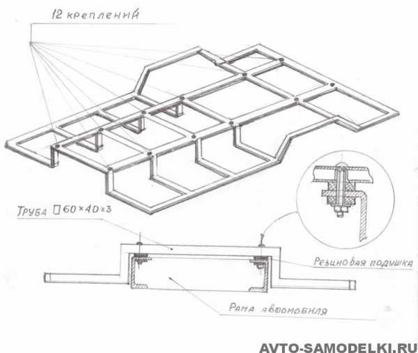 Кузов автомобиля изготовлен на самодельной раме из профильной трубы 60 х 40 х 3 мм, которая установлена на 12 существующих опорных кронштейнов на раме автомобиля ГАЗ-66, через резиновые подушки. На раме изготовлены крепления для сидений.