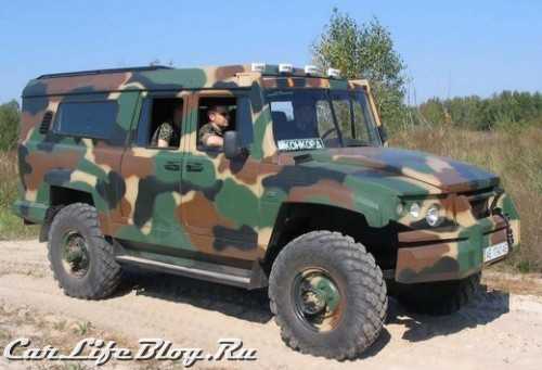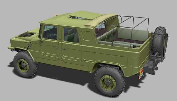 Армейская машина имеет заднюю грузопассажирскую площадку, с откидными сидениями, накрываемую тентом. Как и положенно военной машине она оборудована лебедкой и системой подкачки колес.