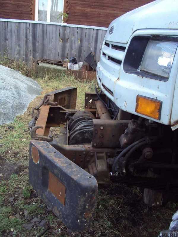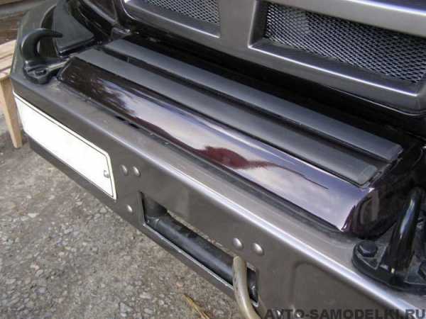 Передний бампер от автомобиля ГАЗ-66, который установлен на существующие места рамы автомобиля. Края бампера отогнуты по форме кузова. На краях бампера установлены габаритные огни и противотуманные фары.