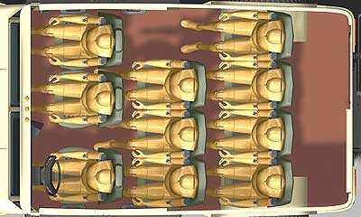 «Трехрядная» планировка позволяет свободно разместить 10 человек. Доступ на задний ряд сидений осуществляется через правую заднюю дверь. Подобная схема размещения рекомендуется для пассажирского и туристического вариантов «Бархана» ( в гражданской версии машины).