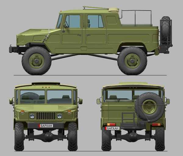 На рисунках представлен один из нескольких вариантов оформления передней части автомобиля со «стандартным» решением для размещения двух круглых фар. Комплект головного света для «Бархана» так же может включать четыре круглые фары, или две прямоугольные. Дизайн передней части, по желанию заказчика, может быть сугубо индивидуальным.