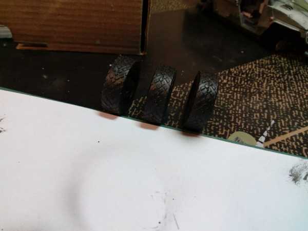На этот момент колеса были полностью собраны. Нанесен грунт Ганзе 1200. Сначала я задул их цветом 79042 Новая резина Акан. Затем по прошелся по рисунку протектора цветом 79043 Старая резина Акан.