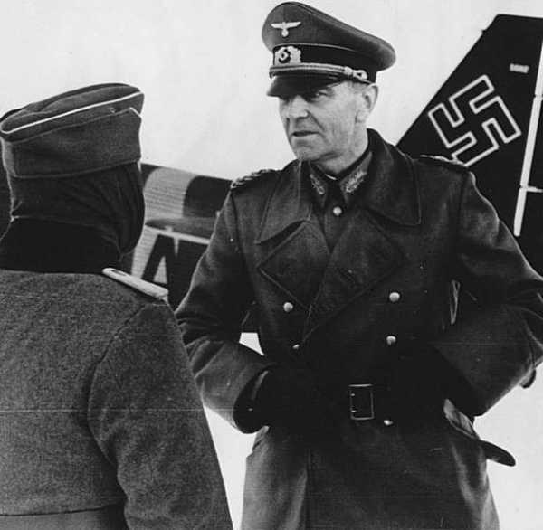 Командующий 6-й армией вермахта генерал-полковник Фридрих Паулюс (Friedrich Wilhelm Ernst Paulus, 1890—1957) разговаривает с подчиненным под Сталинградом. На заднем плане стоит транспортный самолет Юнкерс Ю-52 (Junkers Ju 52).